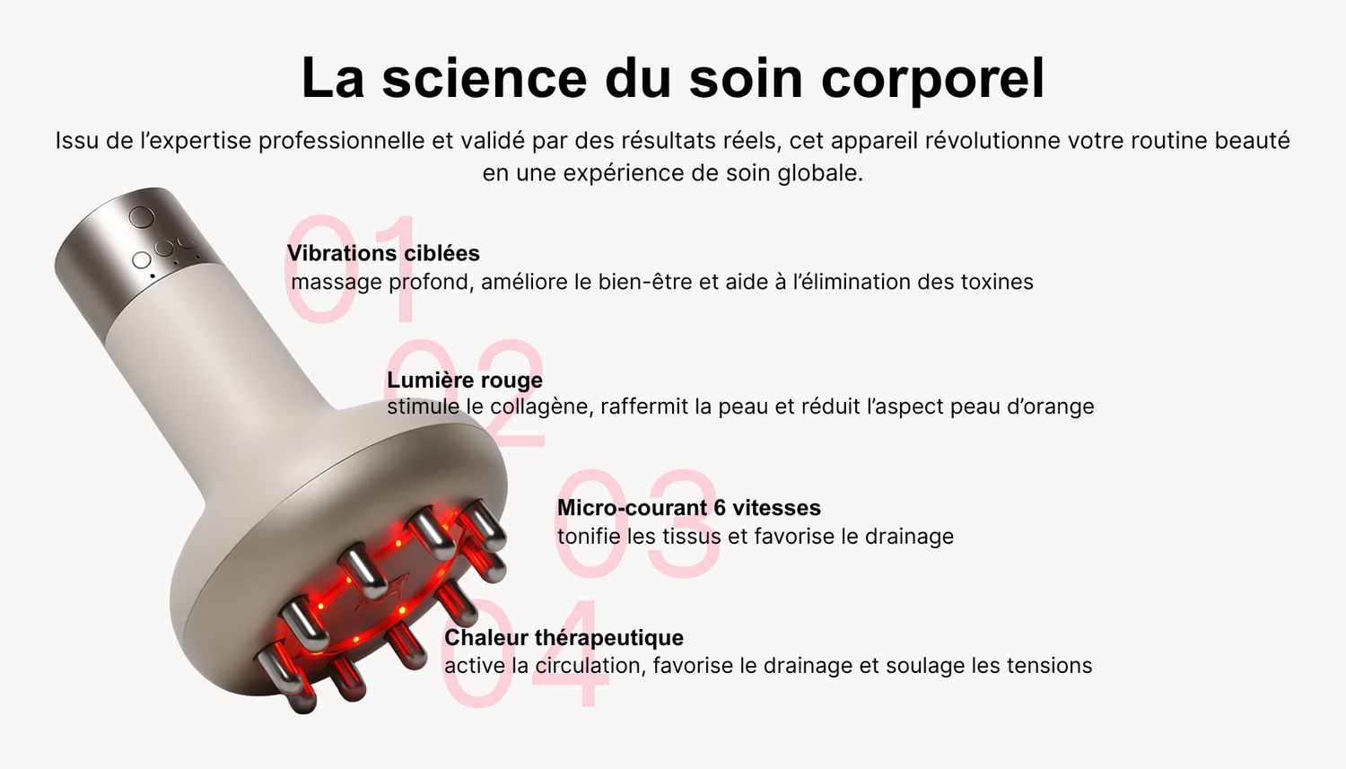 De nombreux articles et études montrent que le micro-courant, le massage mécanique et la chaleur contrôlée peuvent améliorer l’apparence de la peau et la fluidité du corps.
